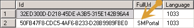 Note that the row which has a value in the FullUrl column (the value will be SMPortal unless you changed it during the installation) has the language set to 1033 which is the LCID for English (US).