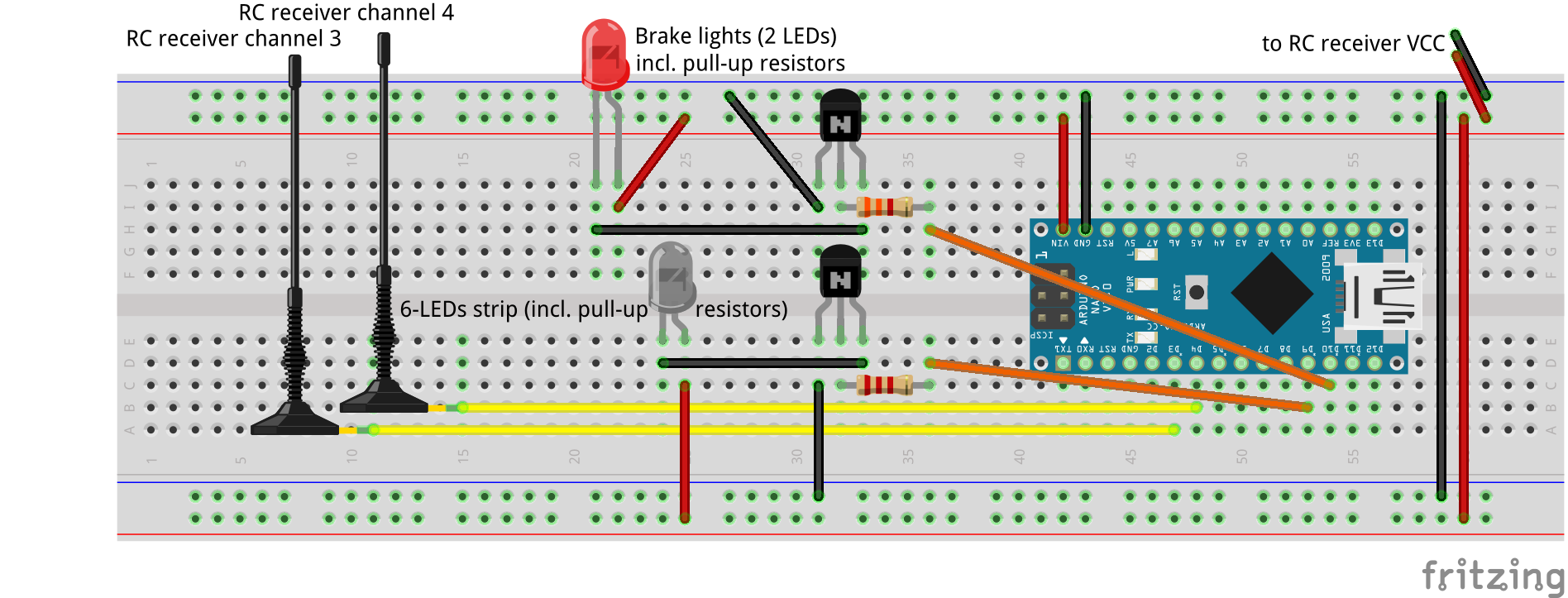 My goal is to be able to switch on the lights (headlights, front fog lights, and tail lights) with channel 3 of the remote control, and with channel 4 the brake lights. Later on I would use the programming possibilities of the remote control to program channel 4 in such a way that it always deflects in the opposite direction to channel 2 (throttle).